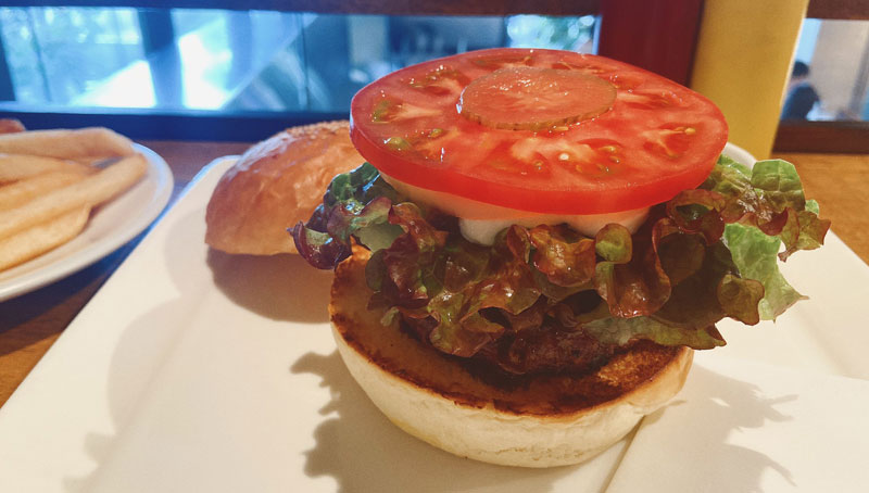 看板メニューは、国産牛100%のジューシーなパティを使った本格ハンバーガー。