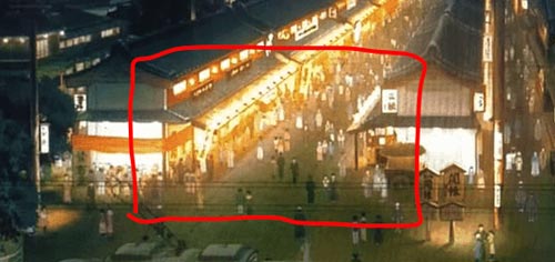 描かれたのはまさにこの場所。目を見張るのは、のぼりや看板なども忠実に再現されている点です。例えば写真右の幟は、本当は「相馬大作」。アニメでは「宗谷大作」。写真左の看板は「佐倉宗五郎」がアニメでは「浅倉愁次郎」。芸が細かいですね。