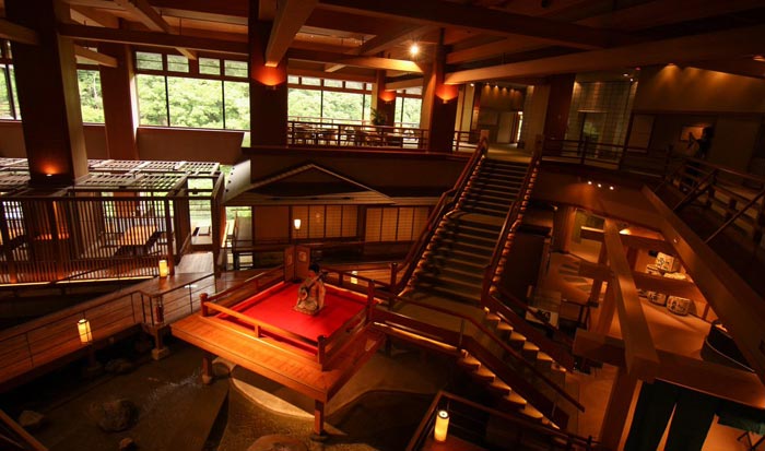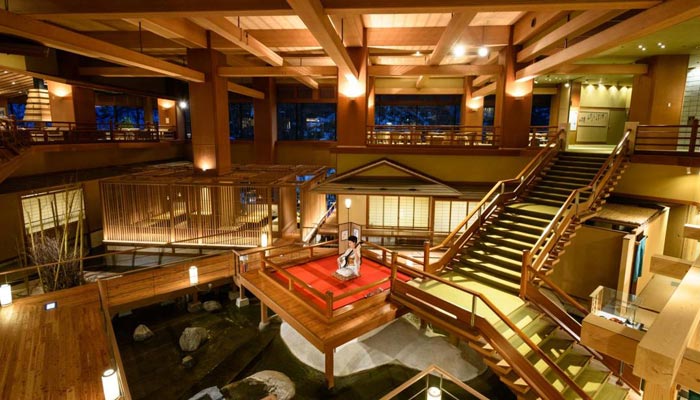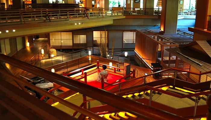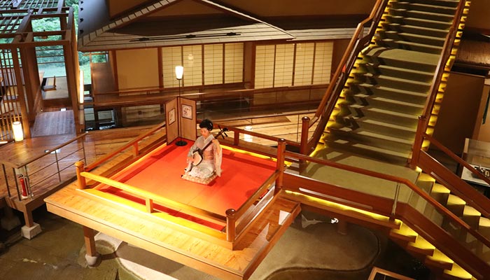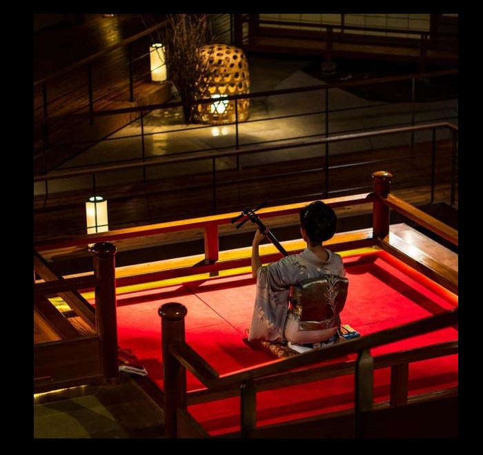 玄関に入りロビーを進むと、吹き抜けになった広い空間が広がり、地下1階が見下ろせます。階下へ降りる階段の踊り場には、ひと際目立つ赤い舞台があります。この「浮き舞台」と呼ばれるステージでは、多くの宿泊客が訪れる午後4時から午後6時まで毎日、三味線の演奏が行われます。