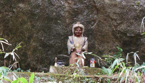 この石には「一刀石伝説」があり鬼滅の刃のストーリーと似ています。柳生新陰流の剣豪、柳生宗厳(石舟斎宗厳)が3年間この地で毎夜、天狗を相手に剣術修行をしました。ある夜、一刀のもとに天狗を切ったところ、天狗の姿はなくこの巨石が真っ二つに割れていたとのことです。現に岩面に天狗の足跡が残るといいます。まさに鬼滅の刃のストーリーのモデルですね。この一刀石の裏にはひっそりと天狗の像が立っています。
