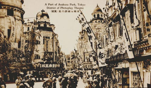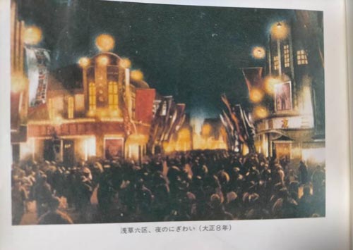 大正時代の浅草六区は、活動写真(映画)、剣劇、浅草オペラ、安来節(やすぎぶし)などさまざまな流行で栄えていました。夜も明るく人で賑わう街でした。