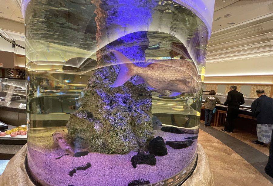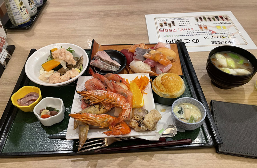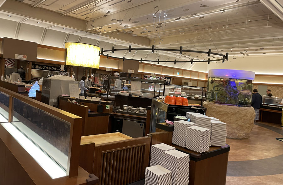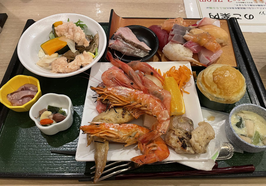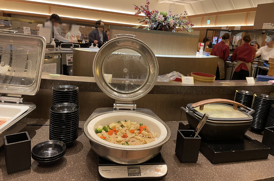 さてさて、待ちに待った食事の時間です。「やまのは」ではビュッフェ形式でいろいろな料理を楽しめます。この旅館を選んだのは魚介を食べたかったこともあります。