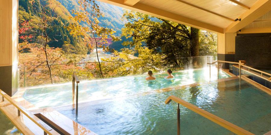 さてさて、お腹がいっぱいになったら今度はお風呂です。お風呂はさすがに写真はとれないので公式サイトから画像をお借りました。風呂が突き出す形になっており先のほうはほぼ露天風呂になっています。
