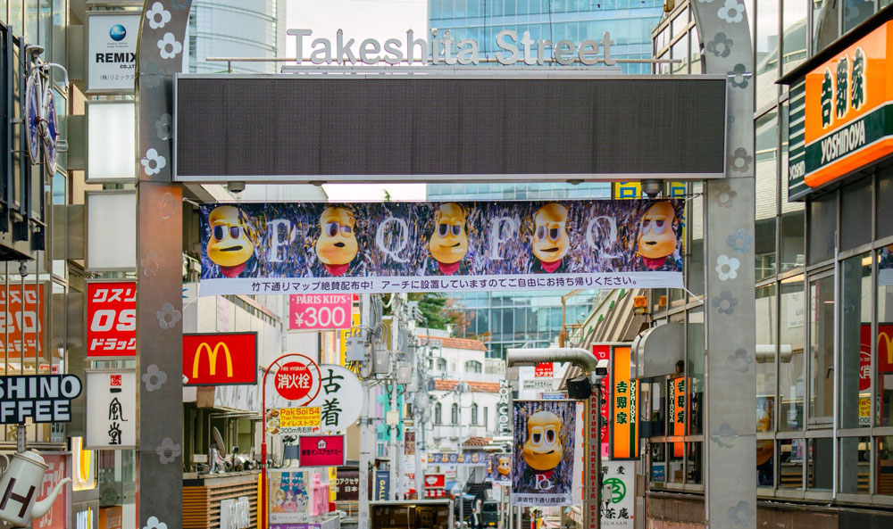 竹下通りの入口にあるカラフルな看板ゲートを抜けると、一転して原宿らしいポップでにぎやかな世界が広がります。