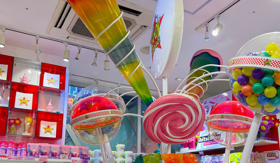通り沿いの店先にはカラフルでフォトジェニックなお菓子やグッズが並びます。