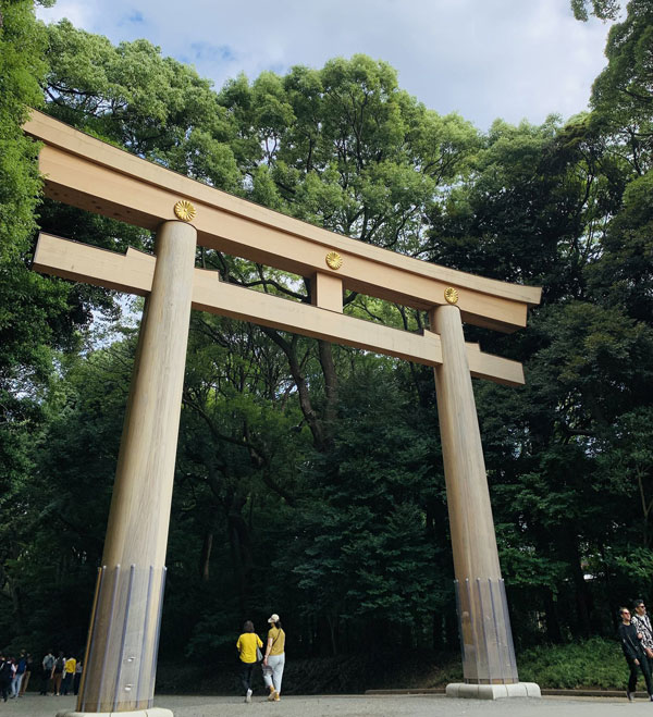 明治神宮の参道入口では、高さ約12メートルにもなる日本最大級の木造鳥居「大鳥居」がお出迎え。