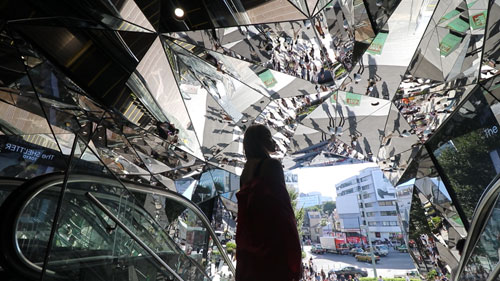 東急プラザ表参道原宿は巨大な万華鏡のような鏡のエスカレーター入口がSNS映えスポットとして知られインスタグラマーにも大人気の撮影ポイントです。エスカレーター周囲の壁と天井に様々な形の鏡がパッチワーク状に張り巡らされ、角度によって無数の風景が映り込む不思議な空間です。鏡に映る人々や街並みを背景に写真を撮れば、まるで万華鏡の中に入り込んだようなユニークな一枚に。