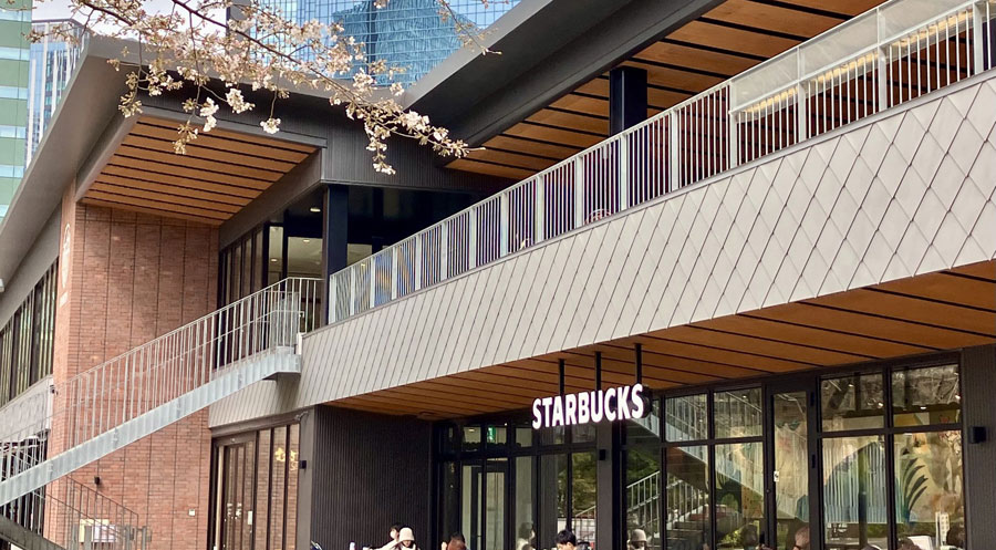 1階にはおなじみのスターバックスがあり、本格コーヒーをテイクアウトしてテラスでのんびりするのもおすすめ。
